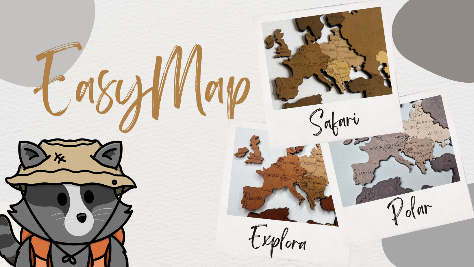 Nuestra colección EasyMap reúne los mapas decorativos más icónicos de Mapache, disponibles en tres estilos: Explora, Safari y Polar. Diseños en madera con acabados únicos para transformar cualquier espacio.
